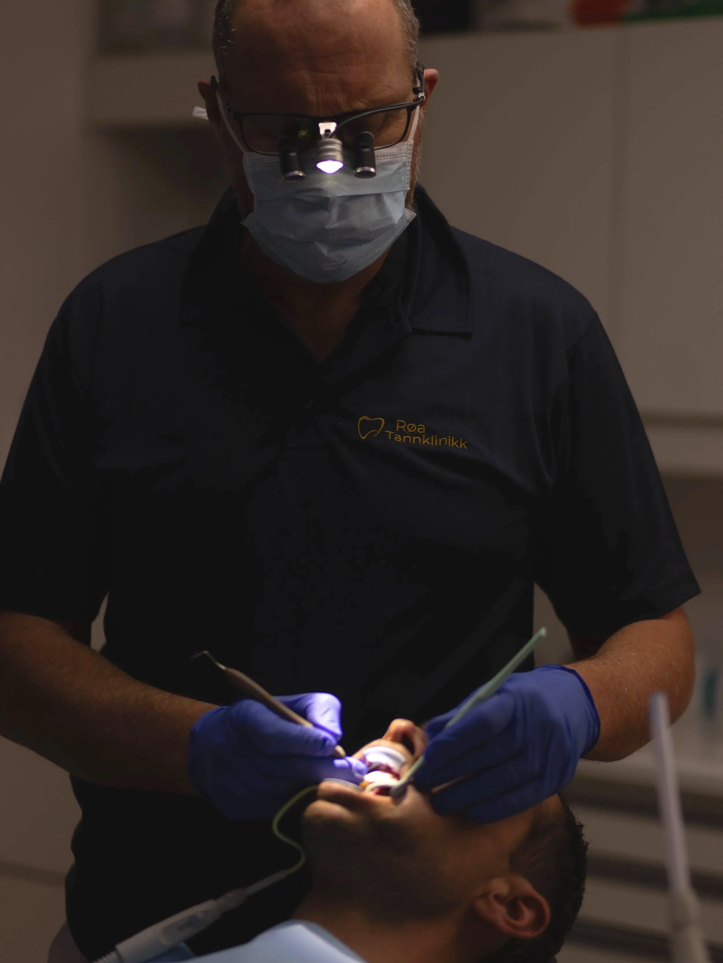 2 røntgenbilder, rens og puss med AirFlow/polering, evt behandlingsplan)